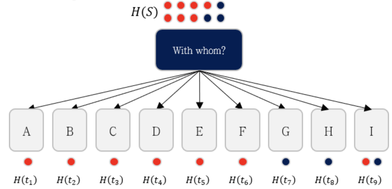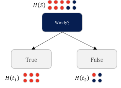만약 이런 식으로 다양한 classification이 되어버리고 각각의 Entropy를 구하여 계산하면 이 Feature가 좋은 Feature일까요? 얼핏 눈으로 보기에는 오히려 아래 그림이 더 좋은 feature로 보입니다. 하지만 각 Feature에 대한 Gain을 구하면 사실 with whom이라는 feature가 더 크게 나오고 windy라는 feature는 더 작은 값을 가지게 됩니다.