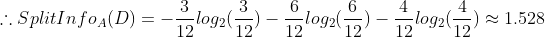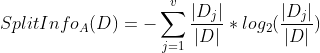 Gain(A)를 구하는 방법은 위 과정과 동일하기 때문에 SplitInfo를 구하는 방법에 대해서만 다뤄보겠습니다. 수식은 아래와 같습니다.
