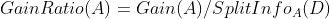 그렇기 때문에 이런 불공평성을 없애기 위해 Information Gain Ratio라는 방법을 사용하기 시작했습니다. C4.5 알고리즘에서는 이를 Gain Ratio 혹은 normalization to information gain이라고 부릅니다. Gain Ratio를 구하는 방법은 기존의 방법에서 SplitInfo를 통해 가짓수에 대한 정규화를 가집니다.
