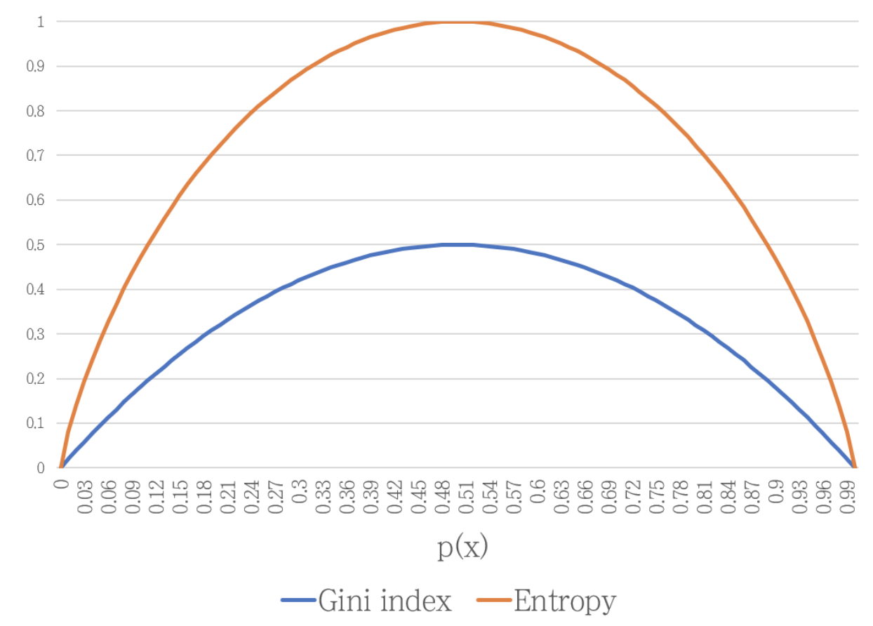 Gini index는 엔트로피와 같이 분류가 잘 될 때 가장 낮은 값을 갖습니다. 따라서 CART 알고리즘에서는