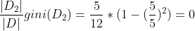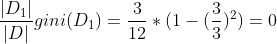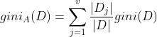 이후 분류된 데이터들마다의 gini_A(D)를 구해줍니다. j = 1일 때,