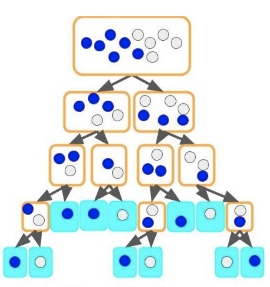 트리를 만드는 기본적인 아이디어는 greedy & recursive approach 에서부터 시작합니다. greedy는 말 그대로 '탐욕적이다' 라는 의미로 Decision tree에서는 가장 좋은 feature 1개 만을 선택하는 역할을 합니다. 여기서 가장 좋은 feature란 현재 들어오는 Input data들을 가장 classification을 잘하는 feature를 의미합니다.