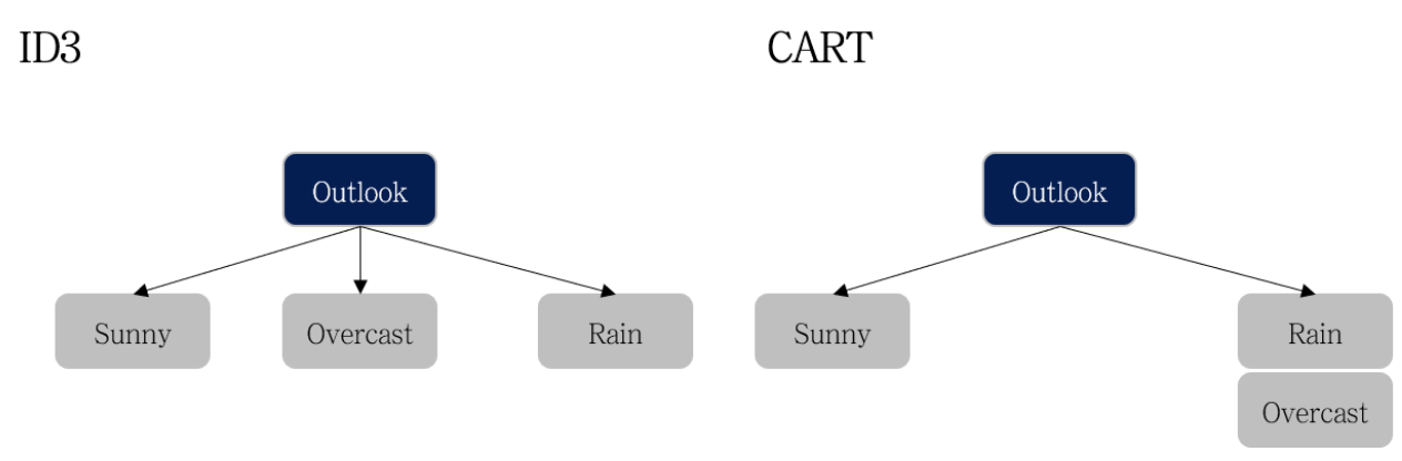CART 알고리즘은 ID3 알고리즘과 비슷한 시기에 개발된 알고리즘으로 Classification and Regression Tree의 약자입니다. 말 그대로 classification, Regreesion도 가능한 알고리즘인데, 앞서 소개한 ID3와 C4.5 알고리즘들과 몇 가지 차이점이 존재합니다.