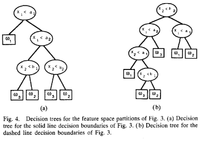Decision tree는 Non-leaf node(branch), leaf node 만으로 구성되어 있는데, 아래의 그림을 보시면 조건식(ex: x < a)이 있는 부분이 branch(non-leaf node)이고 더이상 조건식에 들어갈 수 없는 데이터(ex: w)들은 하나의 leaf입니다.