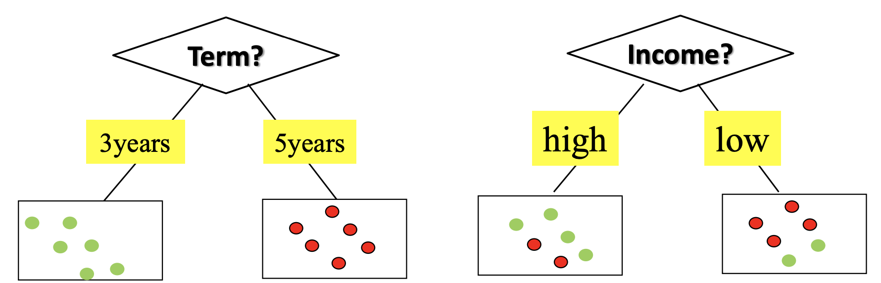 그렇다면 이런 트리구조 즉, 브런치(feature..credit, term, income, age)들을 어떤 순서대로 구성할래? 에 대한 문제를 먼저 풀어야 합니다.
