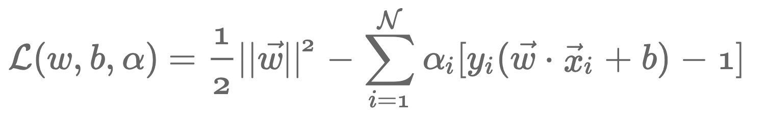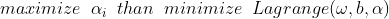 그렇다면 이제 Maximize margin을 찾아야 합니다. 이때, 라그랑지 함수(Lagrange Multiplier)가 사용됩니다.