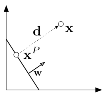 이라는 Unique 한 Decision boundary를 찾은 후에 x에 데이터들을 넣어 양수, 음수에 따라 class를 분류합니다. 그렇다면 우리는 이제 g(x)의 법선(직교) 벡터를 활용하여 Margin을 구할 수 있습니다. 아래 그림에서 d가 margin이고 직선 g(x)에서 x로의 마진을 구해보겠습니다.