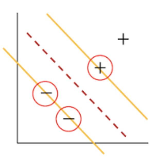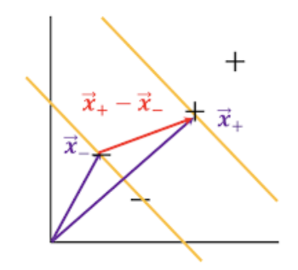 다시 한번 우리의 목표는 어떻게 공간상에서 optimal 한 decision boundaries를 찾는가? 입니다. 여기서 optimal한 decision boundaries는 곧 Maximize margin을 찾는 것이고 이는 곳 아래 그림처럼 '+'와 '-' class 사이 간의 거리를 최대한 넓게 하는 게 요지입니다.