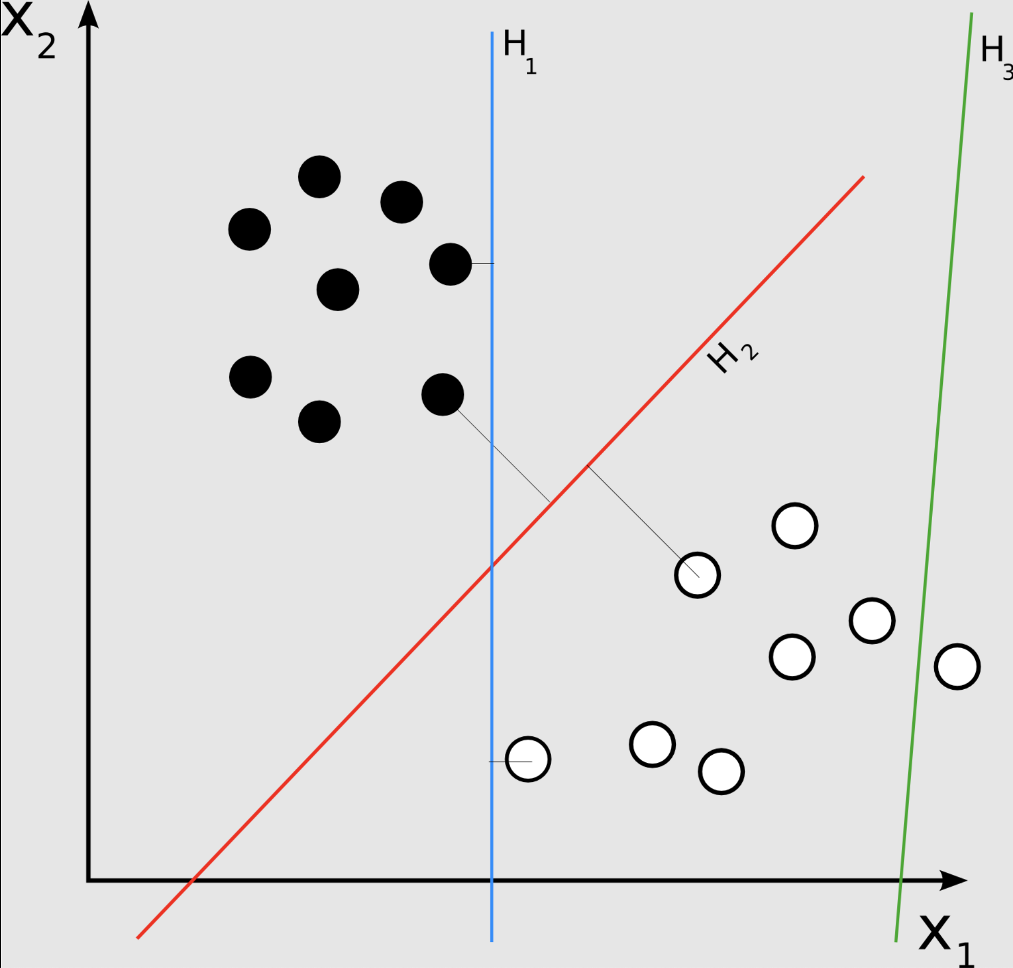 아래의 그림을 보시면 두 개의 class(x1, x2)를 잘 분류할 수 있는 H1과 H2라는 직선이 있습니다. 이때 이 직선들과 가장 인접한 각 class의 data가 곧 기준점이 되고 이 기준점을 support vector라고 부릅니다. 각각의 class들의 decision boundary로부터의 margin을 알 수 있습니다. 하지만 H1과 H2의 margin을 대충 비교해도 H2의 margin이 더 큰 값임을 알 수 있습니다. 우리의 서포터 벡터는 Margin이라는 놈을 Maximize 해야 하니 큰 값을 가진 H2 직선을 골라야겠지요.