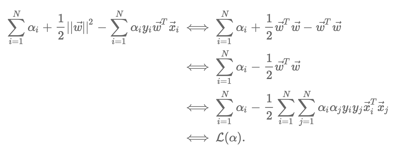 라그랑주 함수 식을 찬찬히 살펴보면 α에 대해 첫째 항은 선형이고 둘째 항은 quadratic 형태이기 때문에 quadratic programming을 사용하면 어떤 알고리즘이든 α에 대한 해를 구할 수 있습니다.