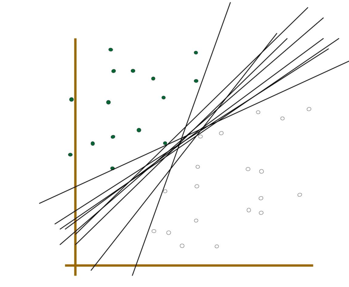 입니다. 아래 그림을 보시면 두 개의 집단이 있고 그 집단을 가장 잘 분류할 수 있는 Linear discriminant function을 만들어야 합니다. 하지만 두 개의 집단을 나누는 직선을 만들다 보니 굉장히 많은데 우리는 이 중에 가장 optimal 한 Linear discriminant function(아래 그림에서는 직선)을 찾아야 합니다. 그 방법으로 서포터 벡터 머신이라는 알고리즘을 사용해 찾아보도록 하겠습니다.