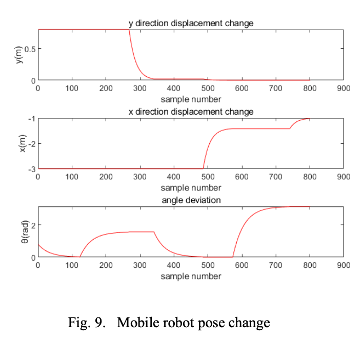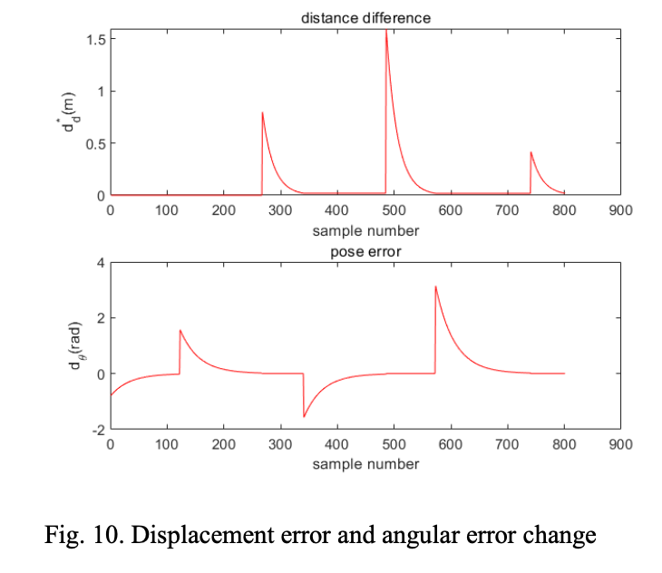 이 논문은 단계별 컨트롤러의 효과를 검증하기 위해 MATLAB을 사용하여 수치 시뮬레이션 실험을 수행한다. 서비스 로봇의 시작점이 (−3.0m, −0.8m, − 𝜋⁄4 𝑟𝑎𝑑)이고, target 위치가 (−1.0𝑚, 0𝑚, −𝜋𝑟𝑎𝑑)이다. 첫 stage에서 순수하게 회전만 하는 pure rotation parameter 𝑘𝑤 = 3.0 이고, 𝑑𝜃 ≤ 0.04𝑟𝑎𝑑 일 때 첫 state control은 멈춘다. 그다음 stage에서는 𝑘𝑣 = 4.0 이고, 𝑑𝑑 ≤ 0.03𝑚일 때 state control은 멈춘다. 이렇게 첫 번째 두 번째 stage를 반복하다 보면 로봇이 도킹스테이션에 접촉한 후 전체 도킹 프로세스가 종료된다.