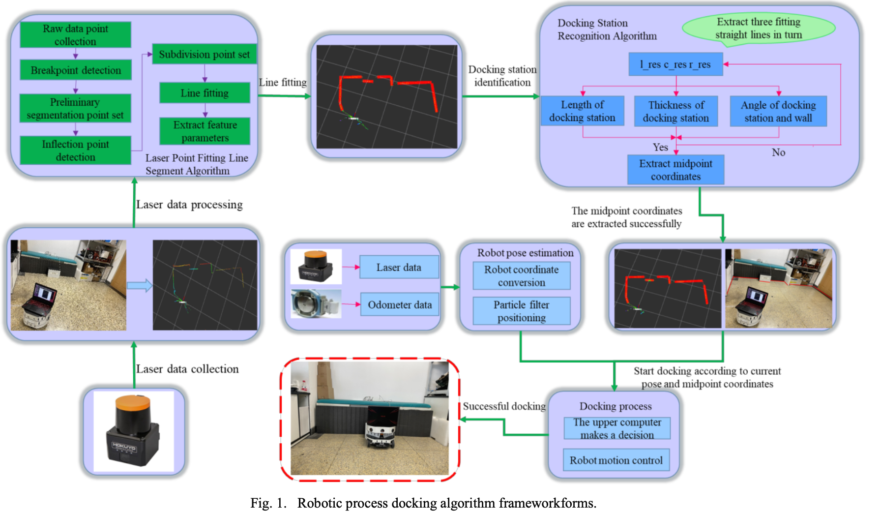 처음에 수집된 레이저 데이터 정보를 바탕으로 직선 segmentation 절차를 진행한다. 그리고 생성된 직선 중 도킹스테이션의 특징 즉, 첫째, 도킹스테이션의 길이 둘째, 도킹스테이션의 두께 셋째, 도킹스테이션과 벽 사이의 평행 관계에 기초하여 어떤 직선이 위 세 가지 조건에 만족한다면 그 직선을 도킹스테이션으로 결정하고 계산하기 위한 인식 접근 방법이 개발된다. 파티클 필터를 사용하여 더 정확한 로봇의 현재 자세와 도킹스테이션으로 부터 각도 편차와 거리 편차를 결정한다. 마지막으로 도킹스테이션에서 현재 로봇의 위치 각도 편차와 거리 편차를 사용한 다중 상태 위치 안정화 모션 컨트롤 사용한다.
