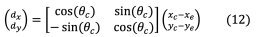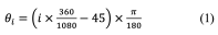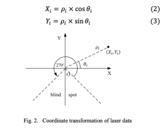 데이터 정보 처리의 목적은 라이다 센서를 통해 수집된 Raw data에서 선분 세그먼트 특징을 추출하는 것이다. 라이다 센서가 직접 측정한 데이터는 레이저 포인트의 거리정보이기 때문에 각도 정보를 계산 할 수 있다. 무엇보다 데이터를 추가적으로 처리하기 전에 극좌표를 데카르트 좌표로 변환해야 한다. 본 연구에서 사용한 라이다 UST-10LX의 데이터 시트 정보에 따르면 270° 범위에서 수집된 데이터 포인트의 수는 1080개이며, 데이터 포인트에 해당하는 극좌표계의 각도를 계산할 수 있다. i번째 데이터의 𝜃𝑖 각도 계산식은 아래 방정식(1)로 얻을 수 있다. 방정식을 풀어 보면 1080개의 데이터를 360도에 나눠 약 0.333도마다 데이터 1개를 얻을 수 있는데 레이저가 첫 시작점이 그림 2 각 좌표계에서 바라보면 –45도에서 시작하기 때문에 –45도를 빼주며 degree to radian을 하여 라디안 값을 가지는 레이저 각도를 얻을 수 있다. 또한, 데이터들의 좌표를 알아야 하는 추가 처리 작업을 위해서는 극좌표를 데카르트 좌표로 변환해야 한다. 극좌표를 데카르트 좌표로 변환하는 식은 아래 그림 2와 같다. 라이다의 회전 방향은 그림과 같이 반시계 방향이며 270도 범위에서 회전을 한다.
