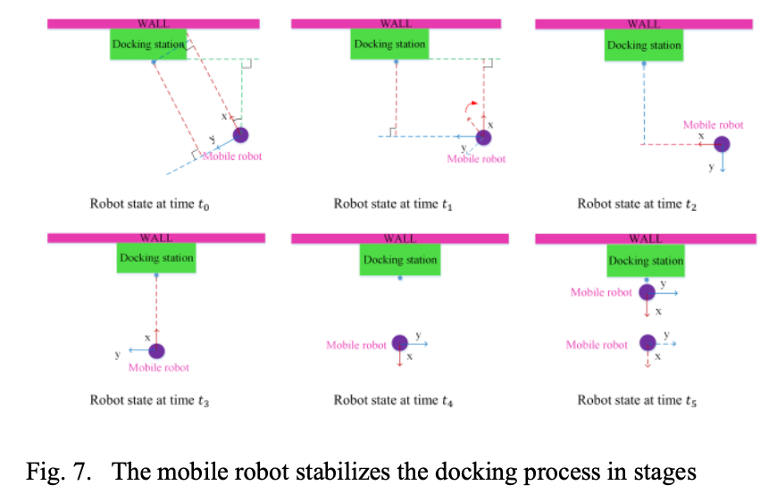 아래 그림7에서 t0에서 현재 도킹스테이션과 로봇의 회전각도 에러를 계산한 다음 에러를 0에 수렴하게 rotation velocity만 주고 0에 수렴하였으면 t1처럼 더 이상의 회전을 멈춘다.
