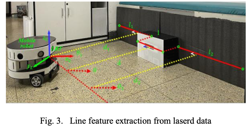 이전 실험 [9]에서 레이저 포인트들의 inlier 즉, 적절한 직선을 찾기 위해 일정한 간격을 갖는 레이저 포인트들의 집단을 만들고 각각의 집단에 최소자승법을 사용하여 그 집단들의 중심을 지나는 직선 세그먼트 작업을 이루어냈다. 이 실험에서도 위 방법과 동일하게 총 3가지의 직선을 세그먼트 하는데 평평한 도킹스테이션 l1 그리고 좌우 벽에 대해 l2, l3을 만들어 (위 그림3 참고) 이 3개의 직선을 바탕으로 도킹스테이션에 대한 특징을 추출해내었다.