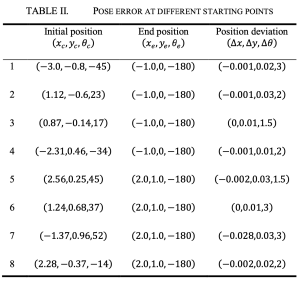 본 실험에서는 실험실에서 자체 개발한 모바일 로봇 플랫폼을 사용하여 진행하였다. 레이저 센서 기반 도킹스테이션 인식 알고리즘과 로봇 모션 컨트롤 방법은 효과적이었다. 아래 표 2는 다양한 위치에서 실험 결과에 대한 결과지 표지이며, 이 결과지는 첫 Initial postion에서부터 End position에 도착했을 때의 robot의 position 편차를 측정한 값이다. 최대 y축 에러는 2cm보다 낮게 나왔고 angle 에러는 3도 이내의 값을 볼 수 있었다.