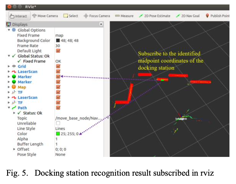 위 세 가지 기준의 특징은 실제 다양한 직선들 중에 도킹스테이션 직선을 찾을 때 강력한 차별성을 제공한다. 아래 그림은 ROS에서 제공하는 3D 시각화 인터페이스를 사용하여 나타낸 그림이다. 이 그림에서 레이저가 수집한 데이터들을 바탕으로 기하학적인 직선 세그먼트 작업이 끝난 결과이다. 그리고 초록색 점은 추출된 도킹스테이션의 중간점 좌표이며, 실험 결과에서 도킹스테이션 인식 알고리즘이 정확하게 식별하였음을 알 수 있었다.