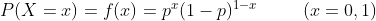 베르누이 확률변수로 구성되어 있는 베르누이 분포는 시행의 결과가 '성공'일 확률을 p라고 한다면 반대인 '실패'일 확률은 1-p가 됩니다. 이때, 베르누이 확률 질량 함수는 다음과 같이 쓸 수 있습니다.