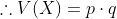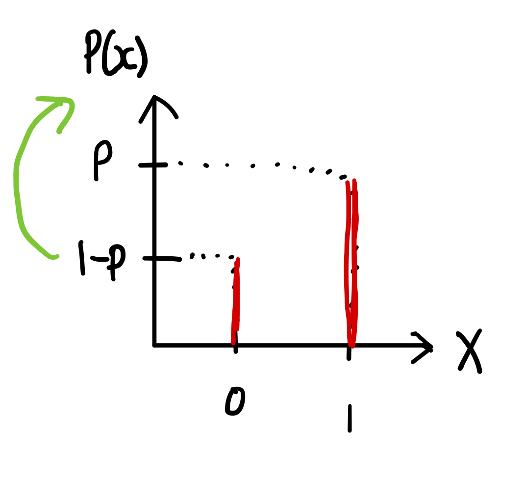결국 분산은 성공할 확률 * 실패할 확률을 곱한 값이 만들어집니다. 마지막으로 그래프를 그려보면 x축에는 확률변수 X가 오고 y축에는 확률변수에 해당하는 확률이 옵니다. (편의상 1-p가 p보다 작을 수 있다고 그렸지만 사실 p보다 클 수도 있습니다.)