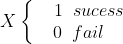 수학적인 예시로 풀어보면, 어떤 확률변수 X가 시행 결과가 '성공'이면 1의 값을 갖고, '실패'이면 0의 값을 갖는다고 할 때, 이 확률변수 X를 베르누이 확률변수라고 부르며, 아래와 같이 표시할 수 있습니다.