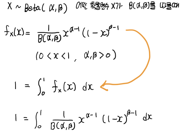[연속형 분포] 베타 분포(Beta distribution) Published May 11, 2020 <!-- --> 이번 포스트의 주제는 베타 분포(Beta Distribution)입니다. 베타 분포의 의미를 이해하고, 기대값, 분산, 적률생성함수를 구해 보고자