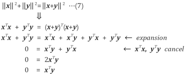 따라서 $2x^Ty$가 되고 2는 상수이기 때문에 무시할 수 있다. 이렇게 피타고라스의 직각삼각형에 대한 정리로부터 내적(dot product)를 유도하였다. 결론적으로 차원이 동일한 두 벡터를 내적하였을 때 그 결과값이 0이면 두 벡터는 직교(orthogonal)하며 두 벡터 사이의 각도는 90도이다.