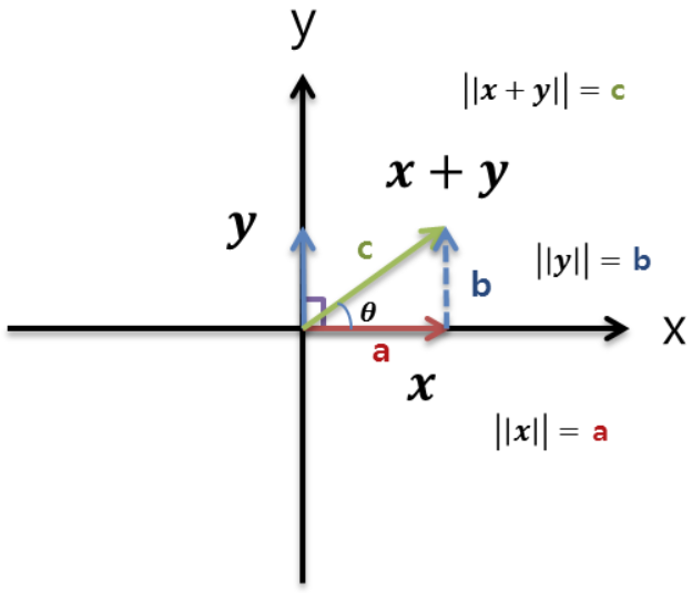 그림 1처럼 $ x + y $ 벡터의 크기는 벡터의 각 요소의 제곱을 더해 제곱근를 씌운 것과 같다. 이 방법은 n차원의 벡터에 모두 동일하게 적용된다.