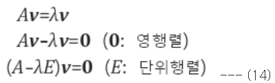 고유값과 고유벡터를 정의하는 식인 식 (1)으로 다시 돌아가서 이를 $v$에 대해 정리해보면 다음과 같다.