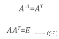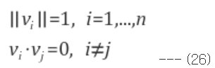 그런데 직교행렬의 열벡터들은 서로 정규직교(orthonormal)한 성질을 가지고 있다. 즉, 직교 행렬을 구성하는 열벡터들은 $ v_1,v_2,...,v_n$이라 했을 때 이들은 모두 단위벡터이면서 또한 서로 수직인 성질을 갖는다. 이는 식 (25)로부터 쉽게 도출될 수 있다.