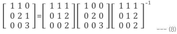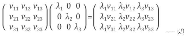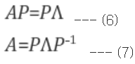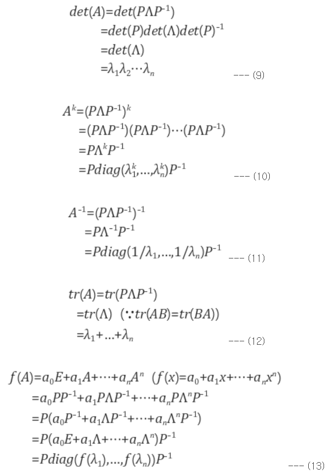 즉, 행렬 $ A $의 고유벡터들을 열벡터로 하는 행렬을 $ P $, 고유값들을 대각원소로 하는 대각 행렬을 $ \wedge $라 하면 다음 식이 성립한다.