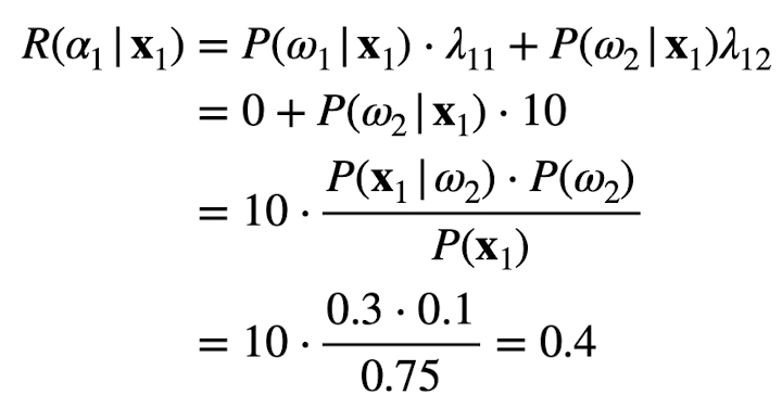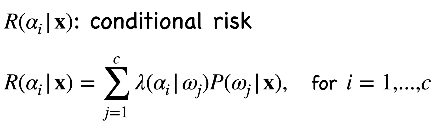 Risk에 대한 수식은 보기만 해도 복잡하다..하지만 각각 쪼개서 생각하면 그리 이해하는데 어렵지는 않습니다. 우선 Risk의 의미는 "어떤 feature x가 있을 때 action에 따른 Risk를 구한다"라고 보면 되는데 수식적으로 풀어쓰면 저렇다. 모든 class c개에 대한 (loss * posterior) 합이다. When R is minimum, it is called the Bayes risk, Best Performance that can be achieved.