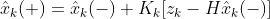 그렇다면 이제 칼만 게인을 구하는 방법을 알아야 하는데... 칼만 추정식에 관측치 z_k를 대입하면 아래와 같이 관측 후 로봇의 상태 모델 추정 식을 나타 낼 수 있습니다.
