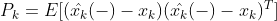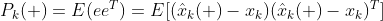 찬찬히 식을 뜯어서 보면 E 기댓값 안에 있는 e 오차들은 1. 관측 후 예측 오차에 대한 정의로 치환을 할 수 있습니다. 그러면 예측 공분산 식은 아래와 같이 만들 수 있습니다.