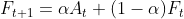 여기서 A는 실측치, F는 필터링 후의 값이고, 간단하게 생각하면 알파 + 베타 = 1 이 나오게 설정이 되어 있는 필터 디자인 모습이라고 보면 됩니다. 이제 위에서 정의한 칼만 추정식을 풀어서 보면 H 관측 모델을 1로 치완하고 알파 베타 형태로 바꾸면 아래와 같이 나타 낼 수 있습니다.